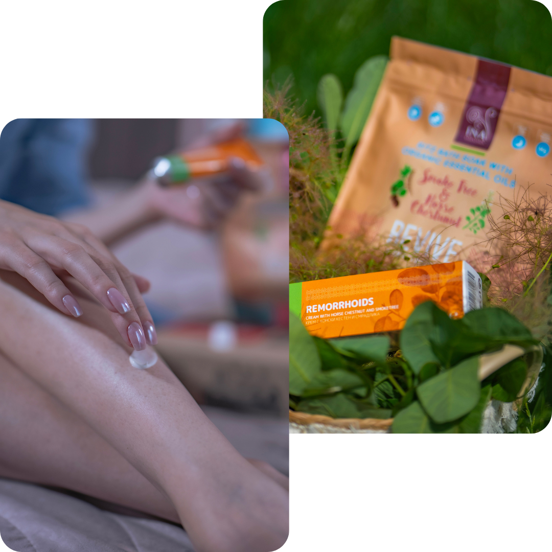 - Stap 1: 1-3 keer per week gun jezelf een ontspannend bad met onze Revive Sitz Bath Salts met rookboom en paardenkastanje. Deze zouten, verrijkt met paardenkastanje-extract en rookboomolie, verminderen het gevoel van zwaarte en vermoeidheid in je benen, verminderen stress en bevorderen de regeneratie van de huid. Het magnesium in de zouten stimuleert de huidregeneratie, wat zorgt voor snellere verlichting van de aangetaste gebieden.