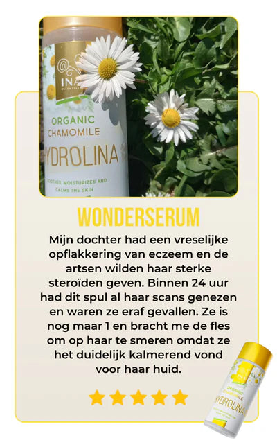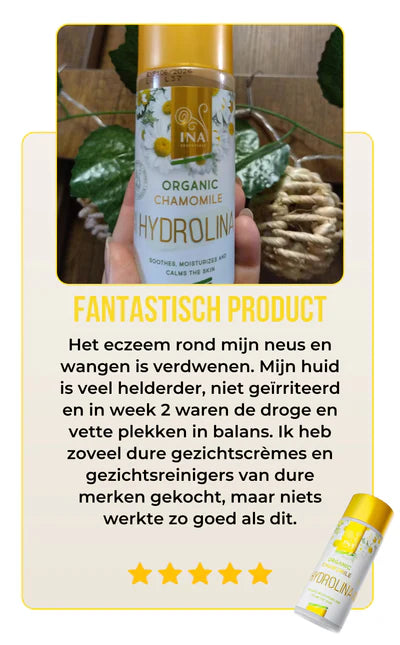 Biologisch Kamillewater Hydrolina (150 ml) is meer dan alleen een prachtige fles, het wordt versterkt door echte klantgetuigenissen. Met een indrukwekkende klanttevredenheidsscore van meer dan 90% toont ons product zijn effectiviteit in het kalmeren van eczeem, huiduitslag en huidirritaties, terwijl het de gezondheid van je huid verbetert. Geloof niet alleen op ons woord, lees de verhalen van onze klanten.