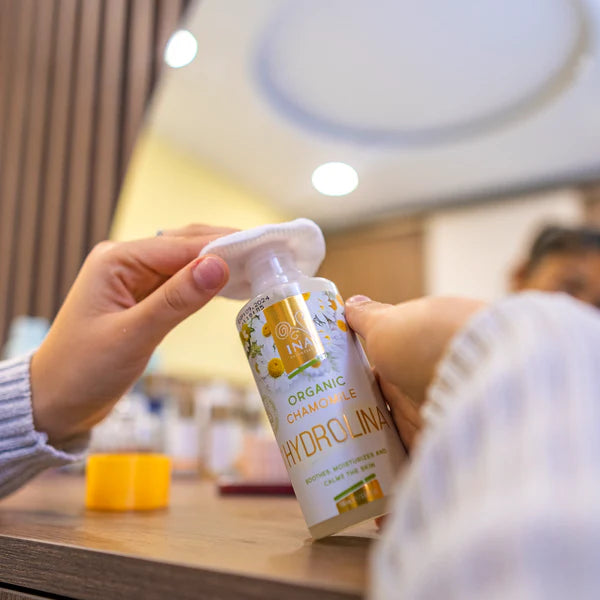 Transformeer je huid Biologisch Kamillewater Hydrolina, ons door de familie gemaakte antwoord tegen eczeem en geïrriteerde huid met kalmerende en regeneratieve effecten. De perfecte keuze voor normale, gecombineerde, droge en gevoelige huid.